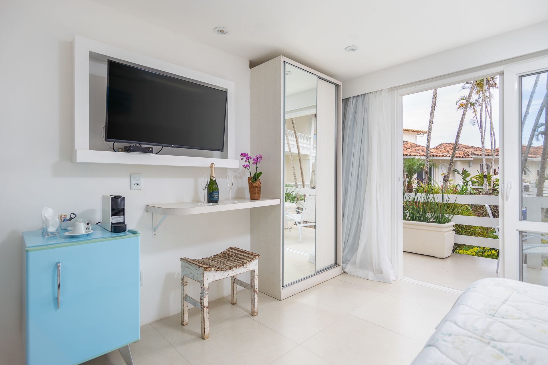 Tv Led, Ar condicionado, maquina de café Nespresso, frigobar, secador de cabelo e cofre. Higiene pessoal: shampoo, condicionador e sabonete líquido.